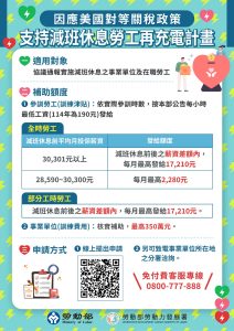 為因應美國關稅政策及國際情勢變化對國內產業和勞動市場的影響,勞動部與相關部會密切關注,全面守護勞工工作權益。勞動部已啟動「減班休息勞工再充電計畫」,專案協助因應美國對等關稅政策等國際情勢協議實施減班休息的在職勞工及所屬事業單位,鼓勵勞工利用減班期間免費參加