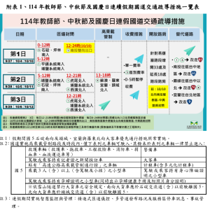 依據人事行政總處於6月13日公布之辦公日曆表,今(114)年下半年除原有中秋節及國慶日連續假期,共新增教師節及光復節共2連假。其中教師節(9月27日至9月29日)、中秋節(10月4日至10月6日)及國慶日(10月10日至10月12日)連假間日期相近,僅相隔約3-4天。為審慎因應,高速公路局