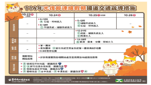 今(23)日為光復節連續假期前一天上班日,西部國道路網於下午16時後車流逐漸增加,國道車多路段包括國1南向東湖至圓山、桃園至中壢轉接道、路竹至岡山、高架堤頂至環北、北向桃園至泰山轉接道、國3北向高原至大溪、西向國10仁武至左營端,其餘國道路段大致正常。截至17時,國道