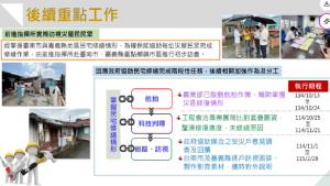 中央災害應變中心前進協調所今(20)日下午召開「轉型馬太鞍溪堰塞湖災後復原重建中央協調會報提醒縣府事項說明會」,由總協調官行政院政務委員季連成主持,說明未來中央前進協調所從「災後救援」轉為「重建復原」後,協調會報下設九大功能分組(堰塞湖處置組、農業復建組、交通