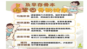 10月20日是「世界骨質疏鬆日」,65歲以上國人近兩成自述罹患骨質疏鬆。國民健康署提醒,骨質疏鬆初期無明顯症狀,但骨折風險高且會影響生活品質,預防應從年輕開始。全民可從存骨5招做起:均衡飲食、規律運動、戒菸限酒、適度日曬及維持理想體重,及早存骨本,預防骨折