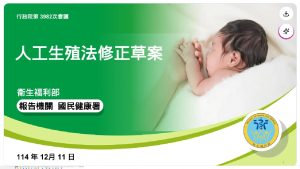 】尊重女性生育自主權,落實「兒童最佳利益」之保護,行政院會今(11)日通過衛生福利部擬具之《人工生殖法》修正草案,將函請立法院審議。行政院副院長鄭麗君請衛福部積極與立法院朝野各黨團溝通協調,早日完成立法程序