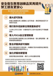 為強化職業安全衛生教育訓練品質,讓勞工朋友們能在安全、優質的環境中學習,勞動部於114年9月4日修正發布職業安全衛生教育訓練規則部分條文,並將於115年1月1日施行,以完備對外招訓單位管理制度,現行所有設立職訓機構對外招訓者,均須於116年底前重新經勞動部認可,方得繼續