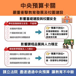 115年度中央政府總預算案持續卡關,許多中央計畫補助經費懸而未決,導致地方政府無所適從。南市教育局盤整中央補助如果未能到位,預估短絀經費達3.4億元以上,如老舊廁所整建工程、中央廚房興整建工程、發展偏鄉教育相關計畫、教師課稅配套、提升教師專業及推動國民中小學課程