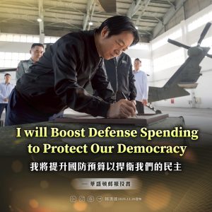 賴清德總統以「我將提升國防預算以捍衛我們的民主」(I...