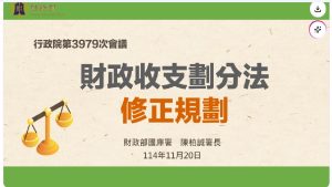 為確保國家永續發展及人民福祉,行政院會今(20)日通過財政部擬具之《財政收支劃分法》部分條文修正草案,將函請立法院審議。行政院長卓榮泰表指出,本案送請立法院審議後,請財政部會同主計總處積極與立法院朝野各黨團溝通協調,並請所有部會加強論述,早日完成修法程序。另