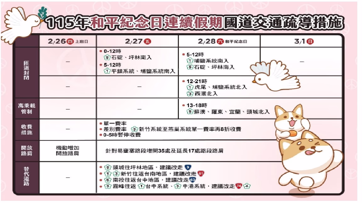 明(27)日為和平紀念日連續假期首日,預估國道交通量為115百萬車公里,為平日年平均(93百萬車公里) 1.2倍,其中南向交通量可達62百萬車公里,為平日年平均的1.3倍,相關疏導措施包括: 0-12時國5石碇、坪林及5-12時國1平鎮系統、埔鹽系統南入匝道封閉,單一費率、國3新竹系統至燕巢系統採單一費率再8折收費、0-5時暫停收費、開放路肩、替代道路、匝道儀控等。
