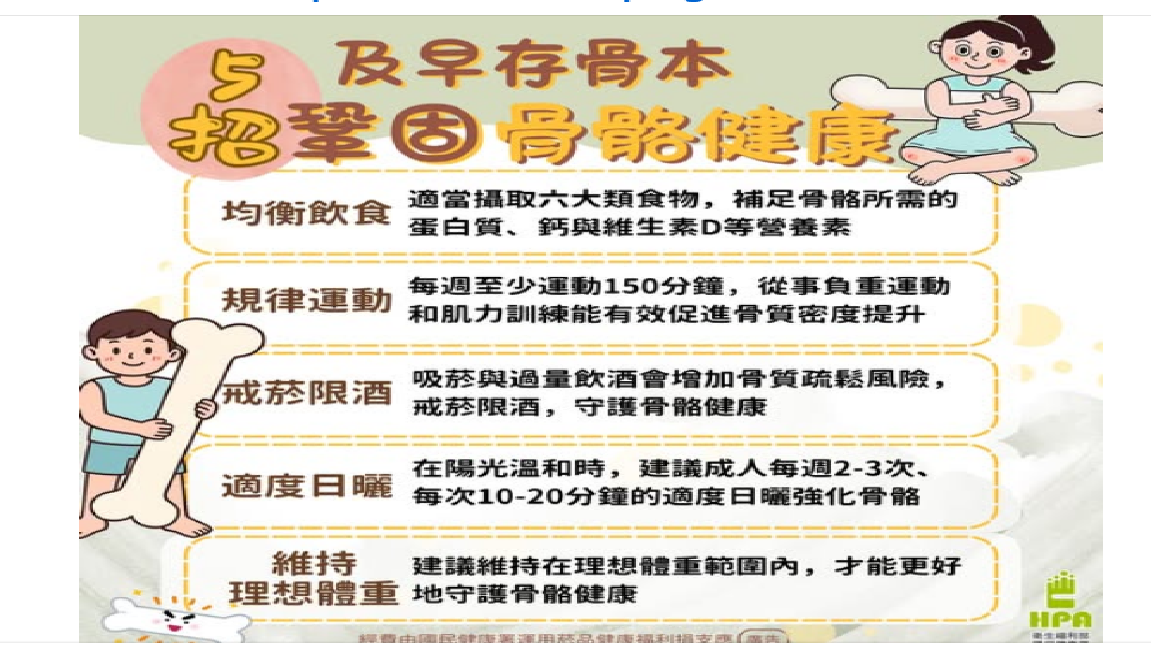 ˙維持理想體重:體重管理須注意,體重過輕者常因骨本儲備少、營養不足而骨質偏低,建議維持在理想體重範圍內,才能更好地守護骨骼健康。2025/10/20