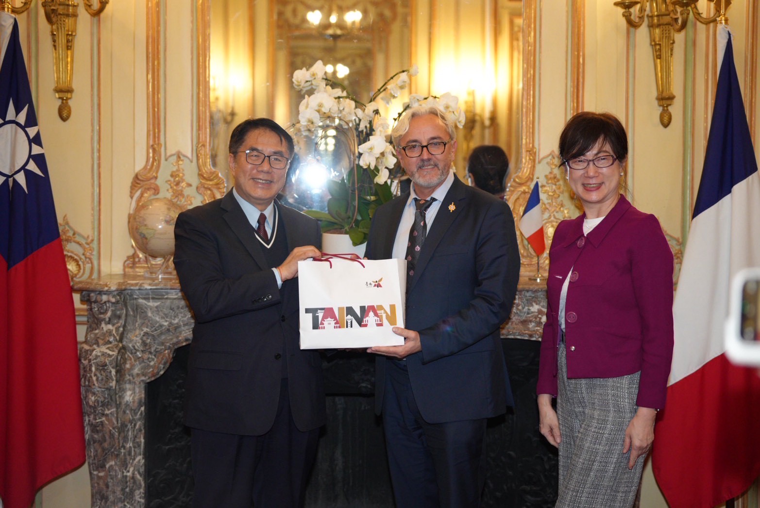 台南市長黃偉哲訪問法國期間,於當地時間4日造訪駐法國台北代表處,並在郝培芝大使的陪同下與法國國民議會友台小組副主席馬堤諾議員(Éric Martineau)會晤,三方就綠能政策、農業貿易、地方政治及國際情勢等議題進行深度會談