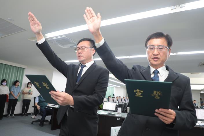 新任仁德區長許博森及將軍區長張介軍今(23)日於市政會議宣示就職,由台南市長黃偉哲擔任監誓人。黃偉哲期許新上任兩位區長能延續過去區長的發展基礎,到任後勇於承擔責任、積極任事,傾聽民意及掌握民眾需求,更要與里長、議員之間有充分協調溝通,讓區政推動與市政密切結合