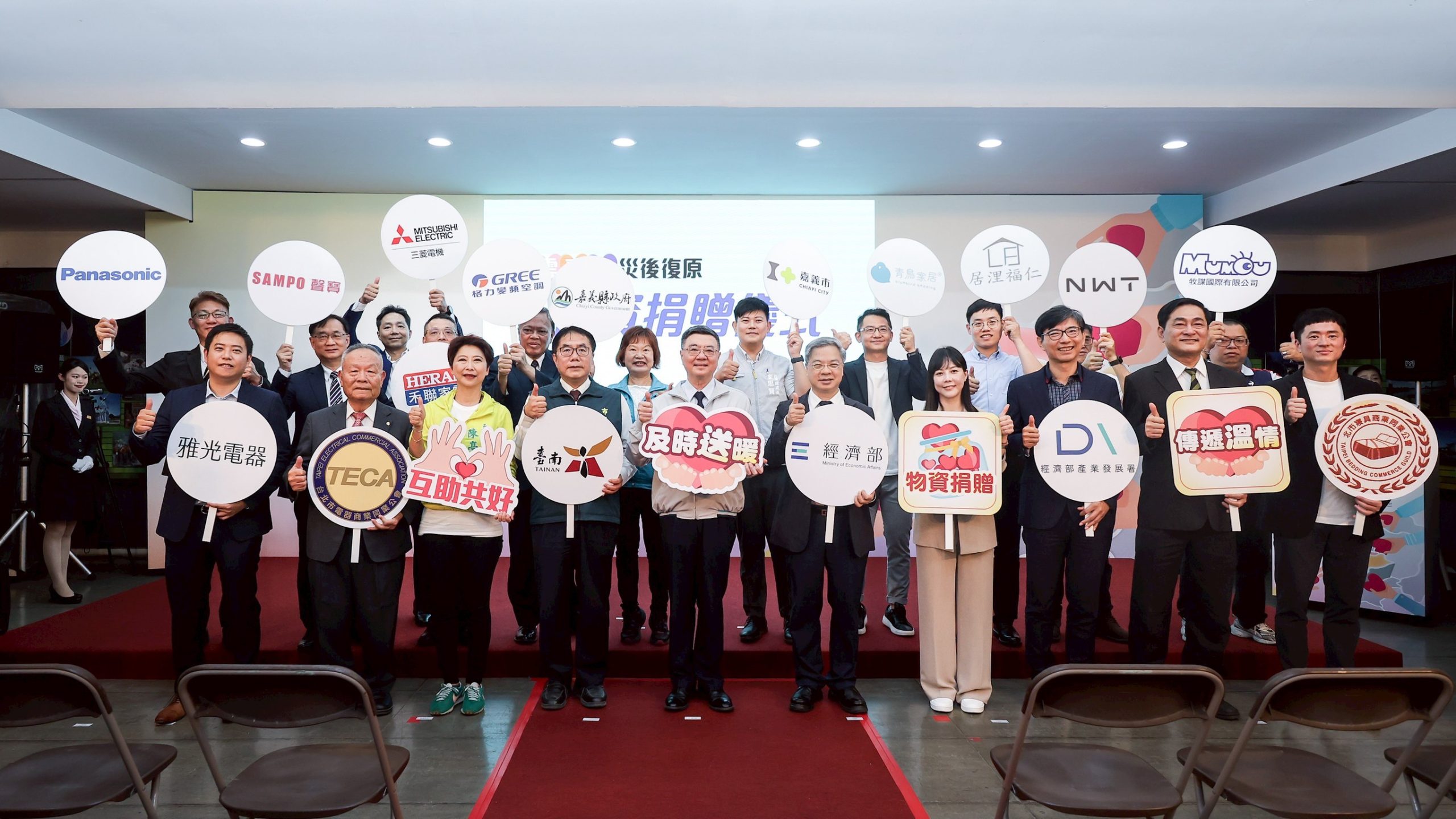 【記者邵潤玲/台南】為感謝電器商業同業公會與寢具相關商業同業公會協調各大企業響應公益,捐贈家電與寢具協助丹娜絲風災受創居民重建家園,台南市政府今(18)日於民治市政中心舉行「雲嘉南災後物資捐贈表揚儀式」,行政院長卓榮泰、經濟部長龔明鑫與台南市長黃偉哲共同出席,卓榮泰並特別頒發感謝狀予各捐贈業者及公協會代表,表達最高的謝意。