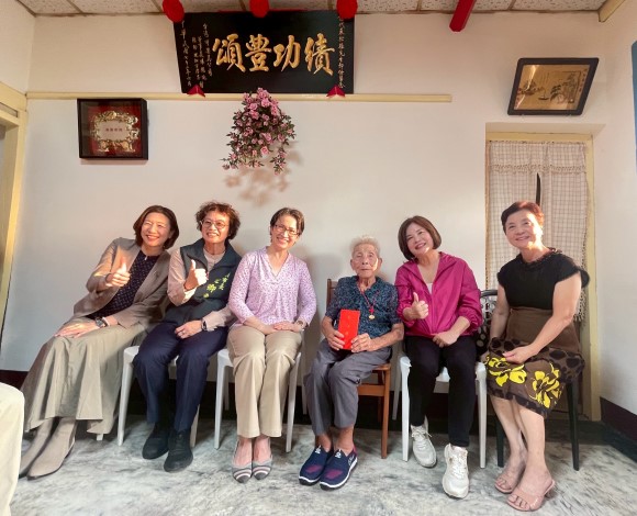 第一站來到官田區101歲陳添結爺爺的住處。陳爺爺雖高齡逾百歲,仍精神矍鑠、步履穩健,談起家人時笑容滿面,回顧早年的艱辛歲月,陳爺爺始終重視子女教育與栽培,如今子女事業皆有成,有的投身教育界作育英才,有的於警界退休,小兒子更在本市六甲消防分隊擔任打火弟兄,持續奉獻社會。值得一提的是,陳爺爺熱心服務鄰里,長年擔任鄰長達38年之久,直到高齡百歲才正式退休。他笑著表示,能長壽健康的秘訣,正是來自於長年服務鄰里、樂於助人的精神與使命感。