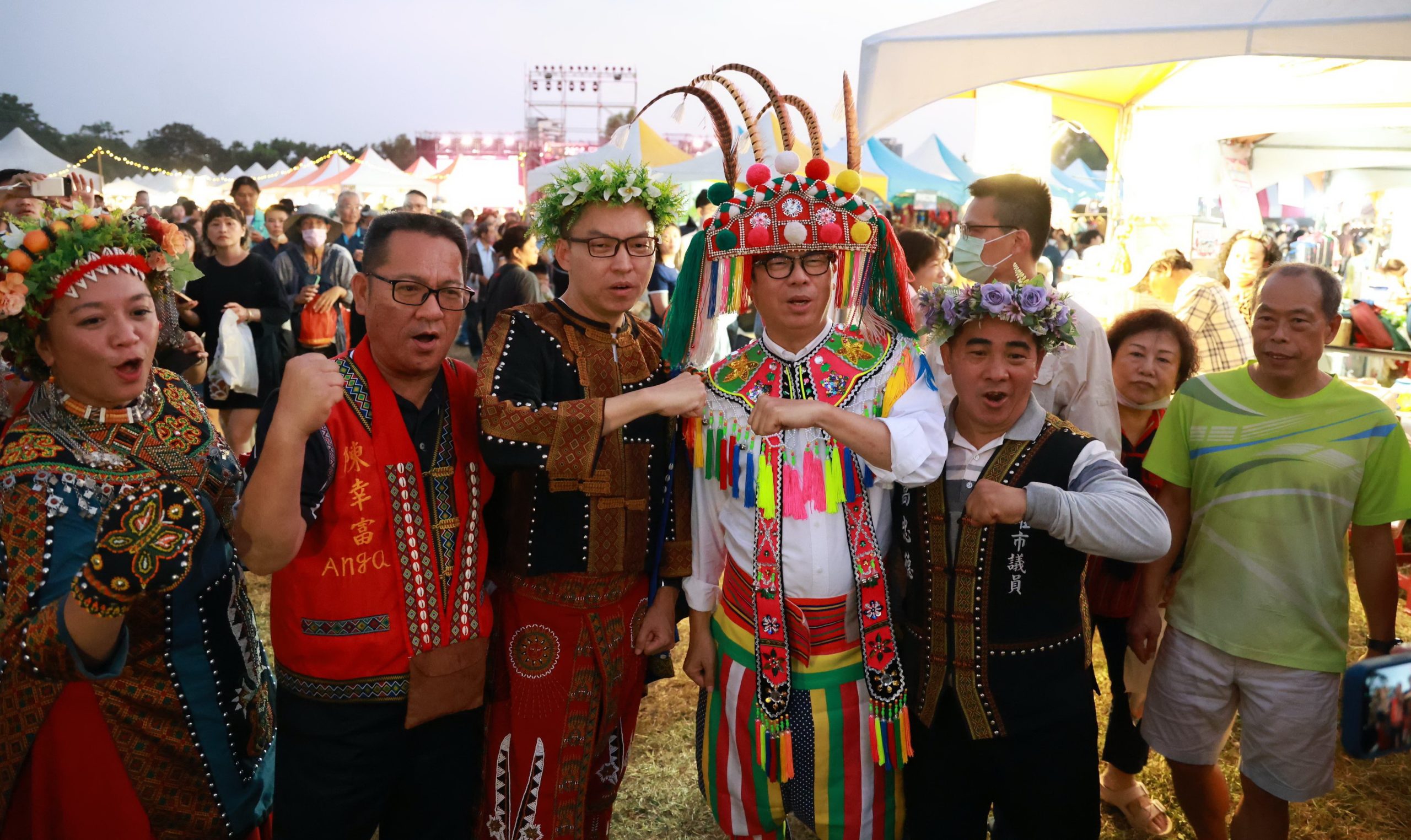 高雄擁有全國最完整的16族原住民族豐富文化資產,「2025 TAKAO豐潮」原住民族聯合豐年節,創歷年規模最大,於衛武營隆重登場,市長陳其邁今(8)日身穿原民傳統服飾,與立法委員邱議瑩和賴瑞隆,以及市議員高忠德、陳幸富、范織欽與黃文益一同參與盛會,並加入千人圍舞行列,與