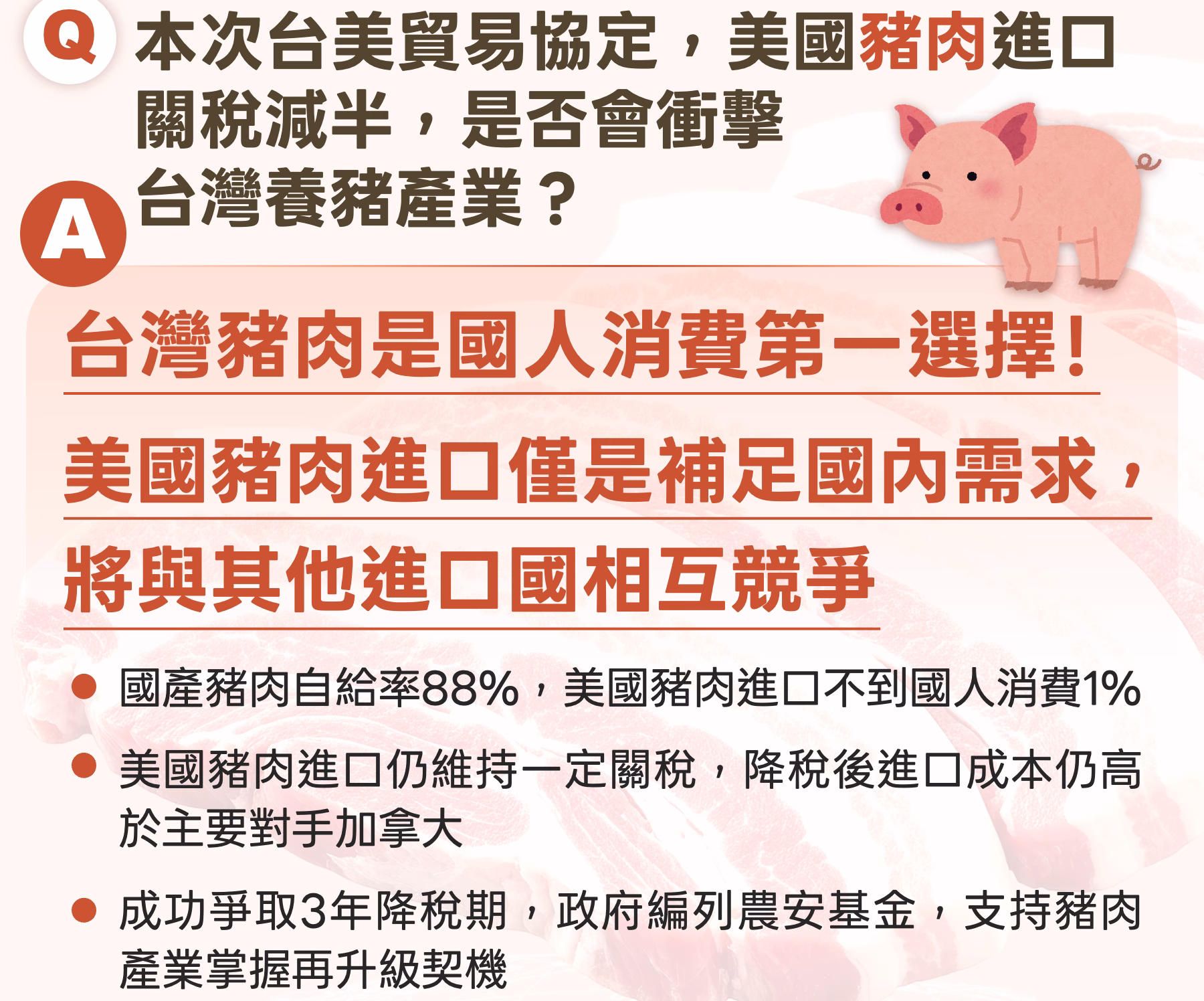 農業部說明,美方在過去10個月的談判中,要求我方全面開放農產品,但基於豬肉是我國最重要的畜牧產業,政府在談判過程中堅持爭取維持一定關稅,談判結果為豬肉品項關稅減半且有緩衝期(第3年調整至6.3%~10%)、調製豬肉及重要雜碎(如豬腳)為關稅減半或降至10%,讓產業得以循序因應,將可能的影響降到最低,確保養豬農民權益及產業永續發展。