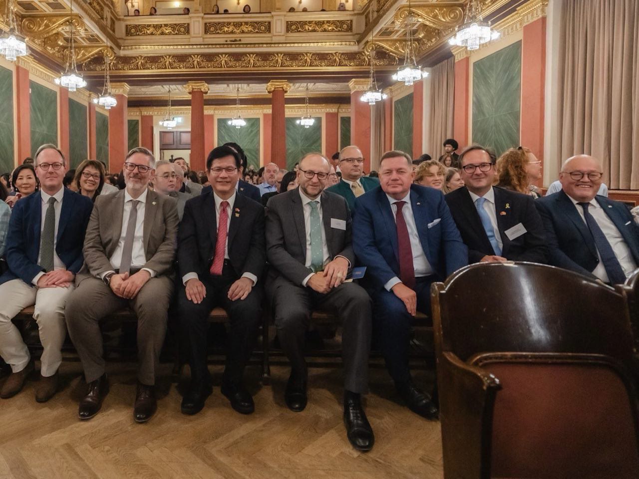 外交部長林佳龍19日率團出席駐奧地利代表處在維也納愛樂協會(Musikverein)布拉姆斯廳(Brahms Saal)舉辦的「當東方遇見西方」音樂會及開幕酒會,與新竹縣長楊文科、奧台協會主席艾蒙(Werner Amon)、跨黨派國會議員Dominik Oberhofer、Laurenz Pöttinger、Ralph Schallmeiner
