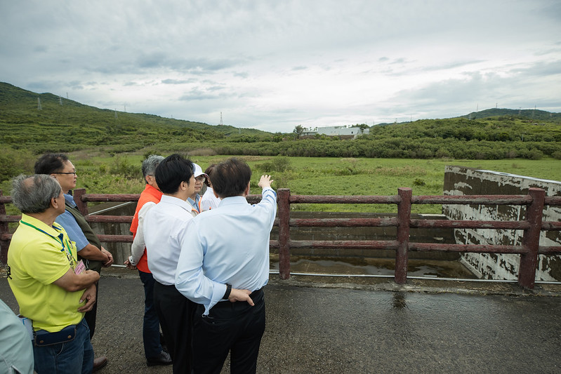 賴總統抵達恆春東門溪滯洪池後,先後聽取屏東縣政府水利處處長江國豐及經濟部次長賴建信針對恆春東門溪滯洪池及屏東治水情形進行說明。