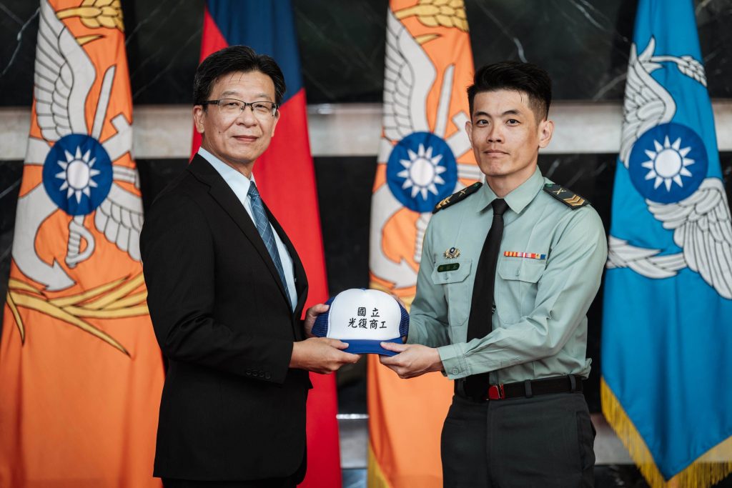 花蓮光復商工校長陳德明接著表示,學校在國軍攜帶重型機具與各界義助團體進駐後,僅21天就奇蹟似地讓學生們重返校園,這份重生的力量來自「全民一心」的團結,也來自國軍弟兄的不畏艱難,官兵不只是災害救援的英雄,更是光復鄉民和所有學子們心中的榜樣。為展現軍民深厚情誼,陳德明校長也特別回贈一頂帽子予陸軍步兵101旅陳保宏士官長,呼應陳士官長在救災期間贈帽予當地小朋友的善舉,象徵「希望的傳遞」,展現軍民深厚情誼。