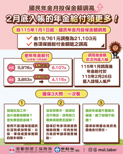 為保障國保被保險人基本生活,並因應物價變動,確保給付金額不因通膨而縮水,自115年1月1日起國保月投保金額由19,761元調整為21,103元,月投保金額調高後,各項以月投保金額計算的保險給付金額亦同步增加