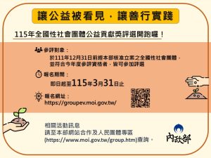 為鼓勵社會團體持續投入公益服務,發揮公民社會正向影響力,內政部持續辦理「全國性社會團體公益貢獻獎評選」,今(115)年度評選活動已正式開放線上報名,報名期限至今年3月31日止(報名網址:https://groupev.moi.gov.tw/)。誠摯邀請長期深耕公益服務的全國性社會團體踴躍參與