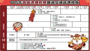 今(115)年春節及和平紀念日連假分別自2月14日(六)起至2月22日(日)止及自2月27日(五)起至3月1日(日)止,分別為9天與3天連假,由於本次2個連假相鄰,交通部已請各疏運單位將2個連假結合成一長連假,進行整體疏運規劃