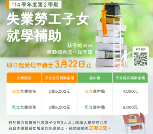 為減輕非自願離職失業勞工子女就學負擔,勞動部辦理失業勞工子女就學補助,114學年度第2學期補助自115年2月3日起開始受理,至3月22日截止申請