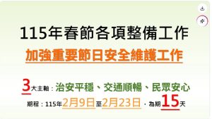 行政院於今(5)日院會由各相關部會提報春節期間強化執政措施,內政部長劉世芳表示,鑒於近期發生隨機襲擊案件,及因應115年農曆春節連續假期將至,警政署將於今(115)年2月9日22時起至2月23日24時止實施「115年加強重要節日安全維護工作」,由全國各警察機關執行,以「治安平穩