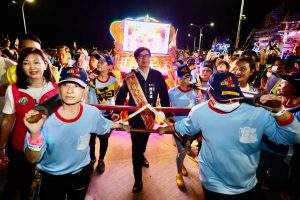 四年一科的「林園鳳芸宮媽祖海巡」,經繞行台南安平、高雄沿海、駐駕高雄流行音樂中心旁、接受各界祝壽祈福及淨港遶境後,活動進入尾聲,鑾轎循海路返抵中芸漁港上岸,高雄市長陳其邁今(12)日晚間親臨現場,除了到岸邊扶轎回宮並出席媽祖回鑾安座儀式。現場人聲鼎沸、宮廟陣頭齊聚,陳其邁隨後與立法委員
