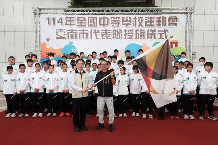 【記者陳怡如/台南】114年全國中等學校運動會將在4月19日至24日於臺南市登場,賽會進入開幕倒數,臺南市長黃偉哲特別在今(10)日親自為臺南市代表隊授旗,為代表臺南市出賽的選手加油及贈送補給品。他也勉勵地主隊要以最佳狀態迎戰全國各地好手,將榮耀留在臺南。市議員Ingay Tali 穎艾達利、沈震東及黃肇輝也到場支持,為選手加油!