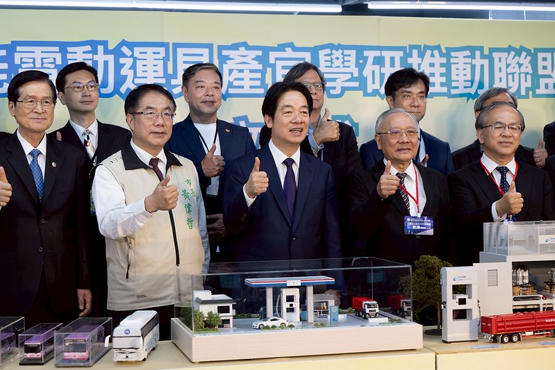 隨後,賴總統與現場貴賓一同進行啟動儀式,並參觀「電動車晶片模組暨充電樁研發製造人才培育基地」,及進行「氫能電動運具產官學研推動聯盟」成立儀式。