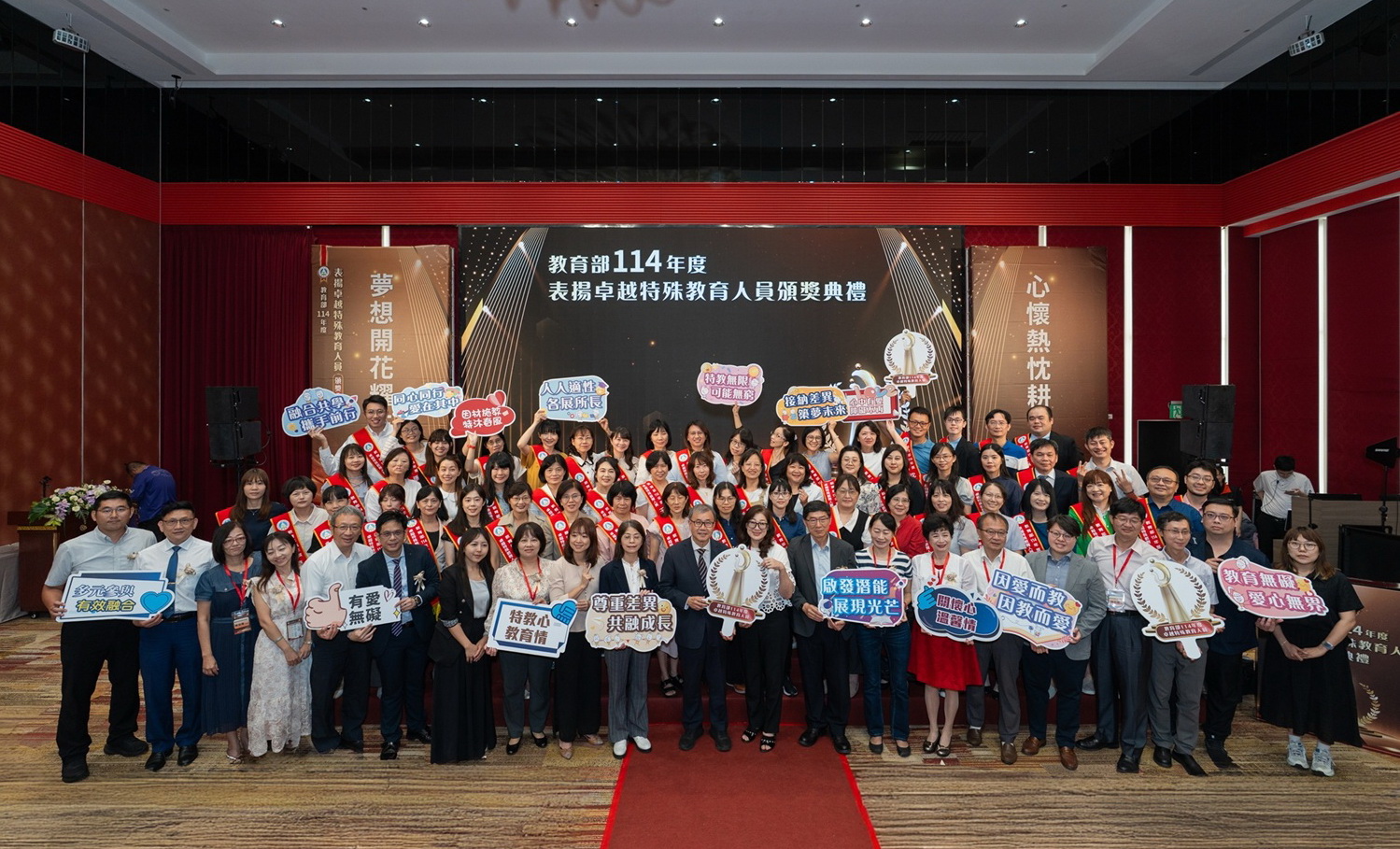 【記者林心欣/台北】教育部今(16)日舉辦114年卓越特殊教育人員頒獎典禮,教育部部長鄭英耀、臺南市市長黃偉哲親臨會場向獲獎人員祝賀,並感謝全國特教老師辛勞的奉獻,全國共有57名獲獎人員,以及近200名教育相關人員與特生家長與會。