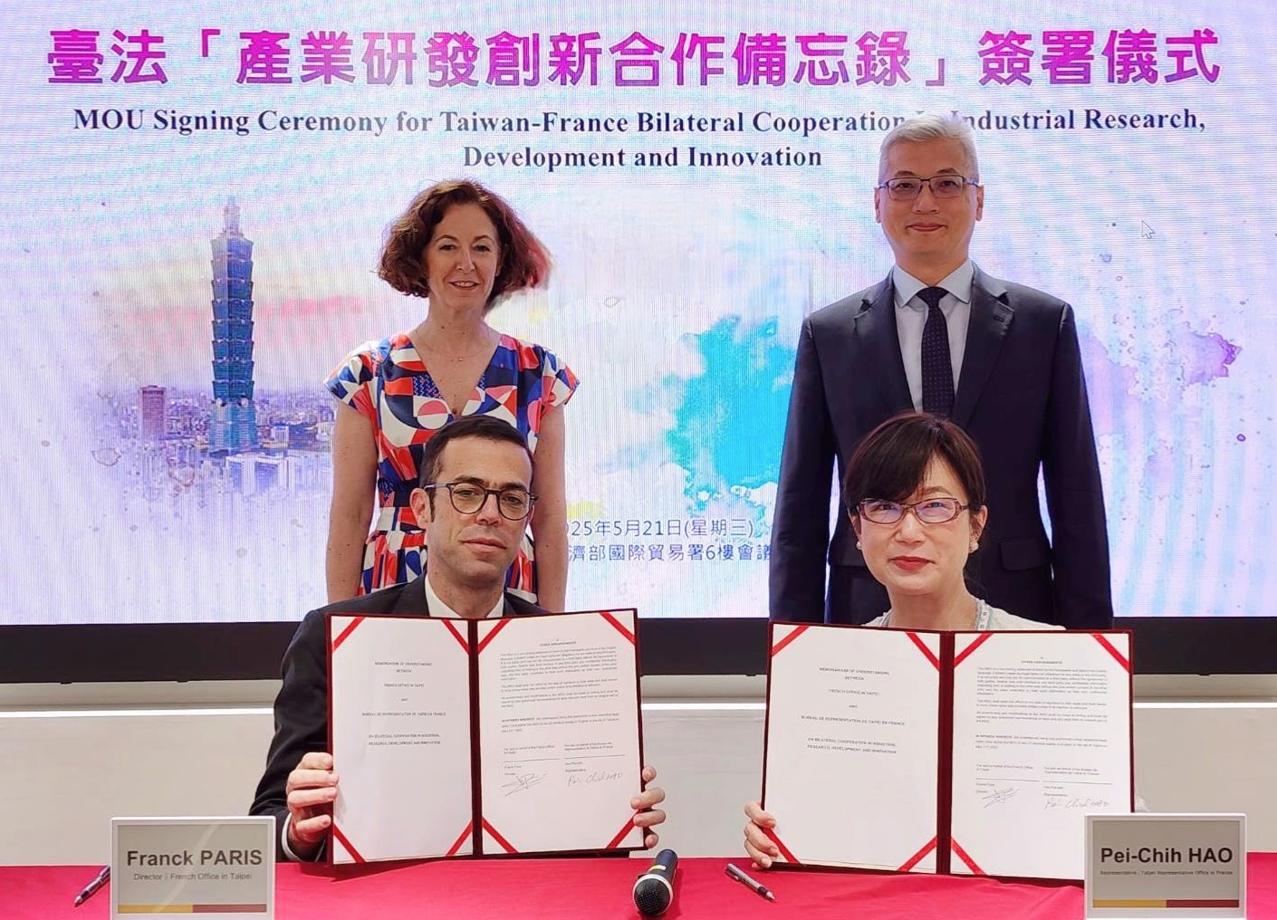 【記者姚宜君/台北】為深化臺法雙邊在技術與創新合作領域範疇,法國在台協會及駐法國臺北代表處於今(21)日簽署臺法「產業創新研發合作備忘錄」,由經濟部產業發展署副署長鄒宇新及法方代表共同見證。