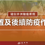 第三,卓榮泰指出,除邊境管制之外,必須全面落實疫調工作。今日現場也有「中華民國獸醫師公會全國聯合會」譚大倫理事長及「臺中市獸醫師公會」石金生理事長出席,臺中市如需要各縣市獸醫前來支援,「中華民國獸醫師公會全國聯合會」會全力配合,全面落實疫調工作。