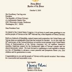 駐美代表處昨日在雙橡園舉辦中華民國108年國慶酒會,會中特別宣讀裴洛西的賀電。裴洛西在這封給「中華民國總統蔡英文」的賀電中表示,她「很榮幸代表美國國會,在中華民國(台灣)108年國慶日向您與台灣人民致上熱切問候」。她並且說,美台在友誼、相互尊重與合作的基石上,有著數十年「不可動搖的紐帶」,關係堅定不移。