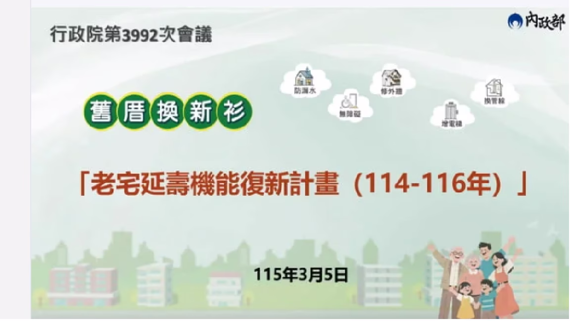 卓榮泰說明,我國屋齡30年以上建築物,已逾半數存在許多空間機能不足、無障礙設施不足、管線老化及高齡者居住不便等問題。面對我國面臨超高齡社會、極端氣候、地震風險及國際情勢變動等種種挑戰,積極改善既有建築物機能並提升居住環境,是當前政府守護人民生命財產安全及提升國家整體韌性的重要工作。