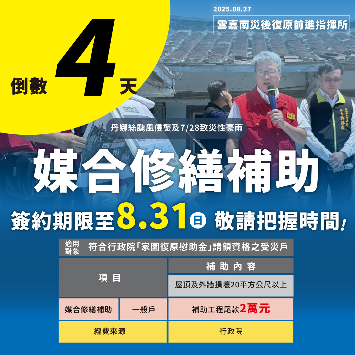 雲嘉南災後復原前進指揮所今(27)日提醒,行政院提供的媒合修繕簽約補助申請期限,將於114年8月31日截止,再次呼籲尚未簽約的災民盡速申請,前進指揮所也在昨(26)日工作會議,請各區、鄉、鎮、市公所與技術團隊持續強化媒合進度,協助符合資格之民眾盡快安心完成簽約程序