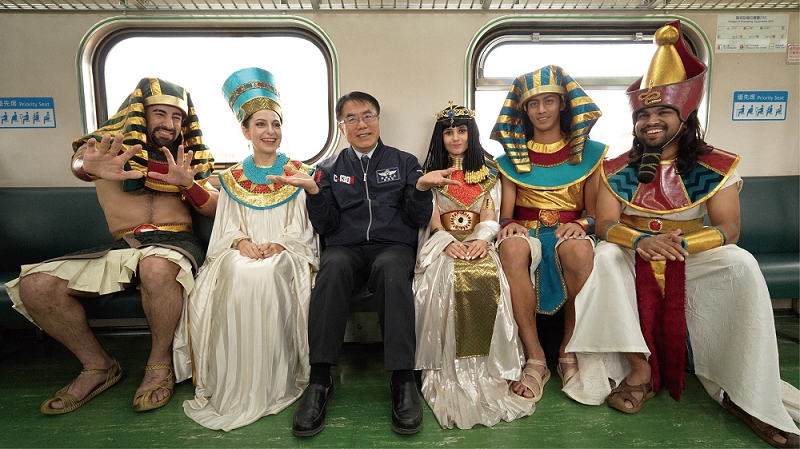 黃偉哲表示,在奇美博物館的努力爭取下,《埃及之王:法老》特展早在去年消息一釋出便話題不斷,可說是未演先轟動,引發各界高度關注與期待,這不僅是歷史、文化界的盛事,更是帶動臺南觀光旅遊的契機,相信透過國際級特展的號召力,可吸引國內外旅客到訪臺南,賞玩各地景點並品嘗在地美食。這次影片拍攝除了推薦搭高鐵到臺南站可多利用TPASS搭乘台鐵沙崙線到保安站步行前往奇美博物館外,更可運用YouBike、大臺南公車…等玩遍臺南。最有趣的是在搭乘台鐵沙崙線火車時,與五位法老拍攝嚴肅照片致敬《博物館驚魂夜》經典畫面,歡迎大家多留意影片細節。