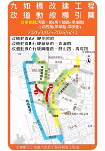 九如橋改建工程為力拚提前開放全線通車,工務局新工處今(23)日表示,自115年3月2日起至115年6月30日,九如四路(華安街口至翠華路口)、河西一路(厚生路至馬卡道路)全線封閉施工,提醒用路人提前規劃改道