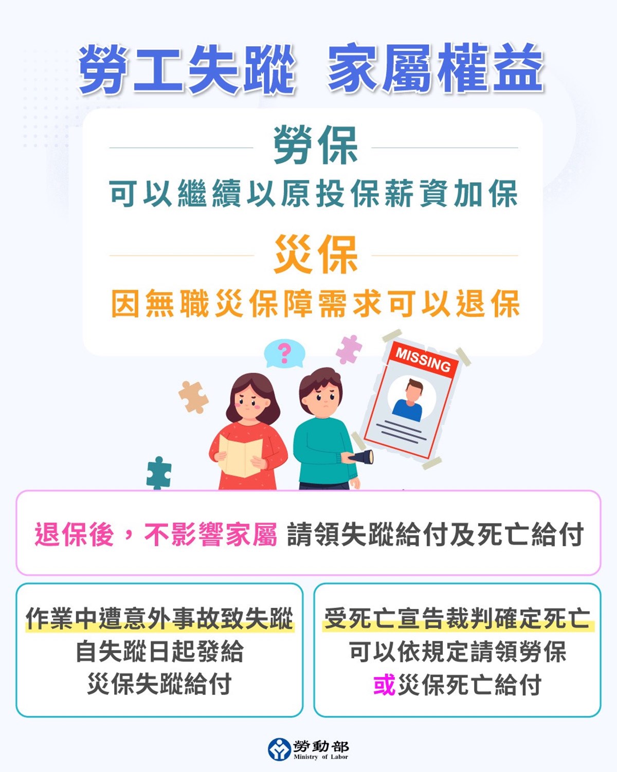 勞工保險(勞保)及勞工職業災害保險(災保)為在職保險,當勞工不幸失蹤,針對雇主是否該繼續為勞工辦理加保,以及失蹤勞工的家屬申請保險給付的權益,讓勞動部來跟大家一一說明